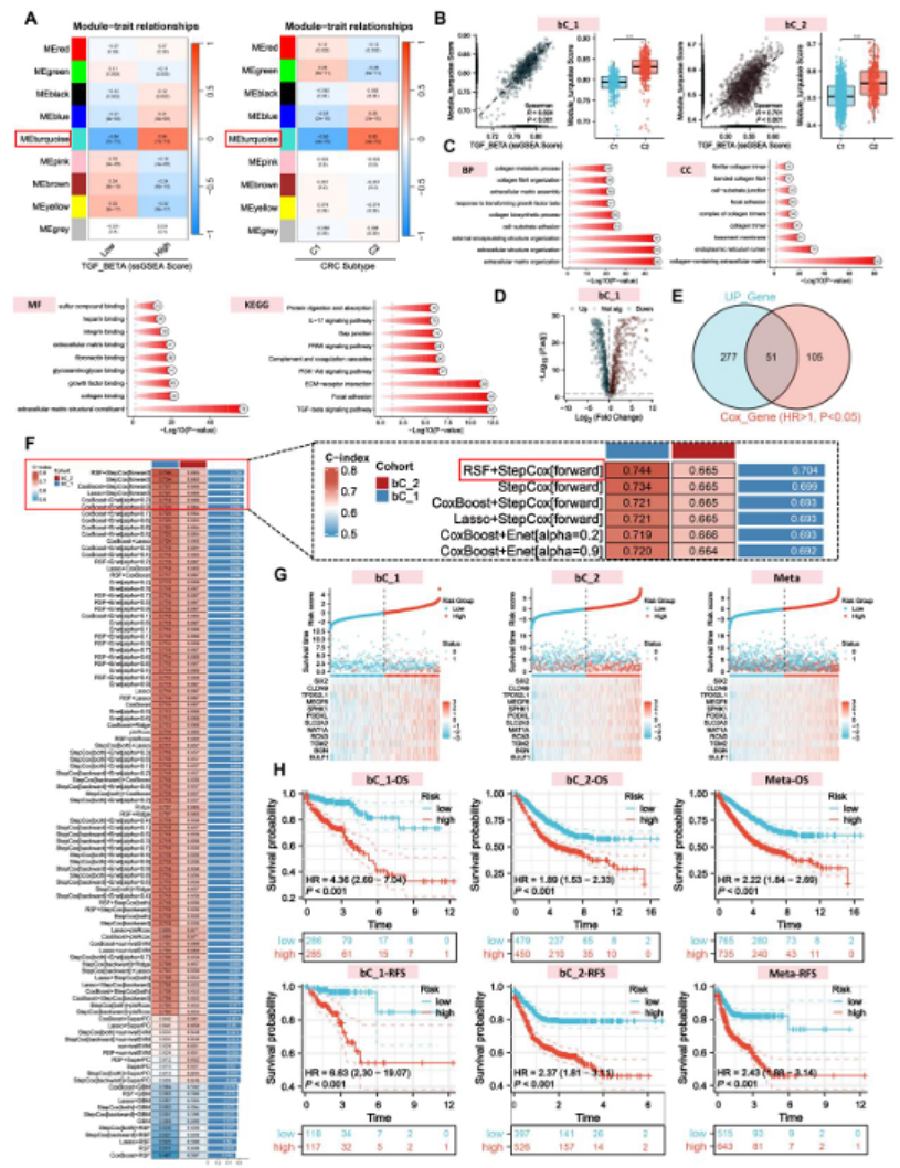 模型构建:通过 WGCNA 筛选 TGF-β 相关核心模块,结合 Lasso、随机生存森林等机器学习,最终得到 12 基因 TGF-β 相关风险签名(TGFRS)(图 3A-G)。