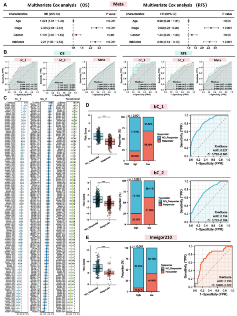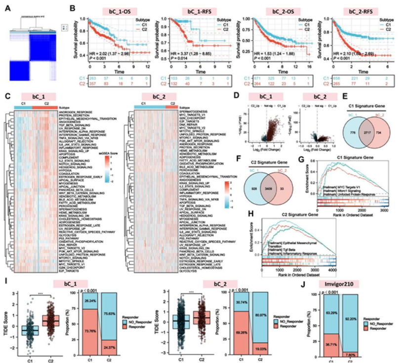 免疫耐药关联:TGF-β 高活性患者 TIDE 评分更高,ICIs 治疗无应答率超 75%(bC_1 中 75.6%),在独立 IMvigor210 队列中预测耐药的 AUC 达 0.786(图 1F-G)。