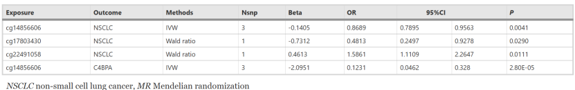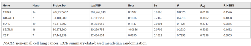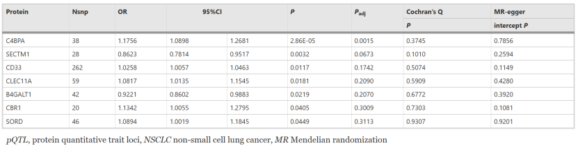 pQTL(蛋白 QTL):验证蛋白水平 —— 发现 C4BPA 蛋白越高,NSCLC 风险越高,就算校正 FDR 后仍显著(表1);