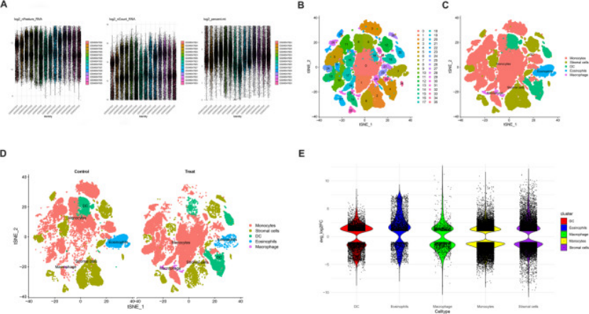 想找 NSCLC 相关基因,先搞清楚 “哪个细胞里的基因在作妖”!作者用 scRNA-seq 分析了 8 例 NSCLC 组织 + 6 例癌旁组织,先做质量控制(排除低质量细胞),再用 t-SNE 聚类分出 36 个细胞簇(图 2B),最后注释出 5 类核心细胞:树突状细胞(DC)、嗜酸性粒细胞、巨噬细胞、单核细胞、基质细胞(图 2C-D)。接着针对每类细胞做差异分析,挖出 “在肿瘤细胞里高表达、癌旁低表达” 的 DEG(差异基因)(图 2E)—— 这一步就把 “万级基因” 缩小到 “细胞特异性 DEG”,后续找靶点不用瞎猜!