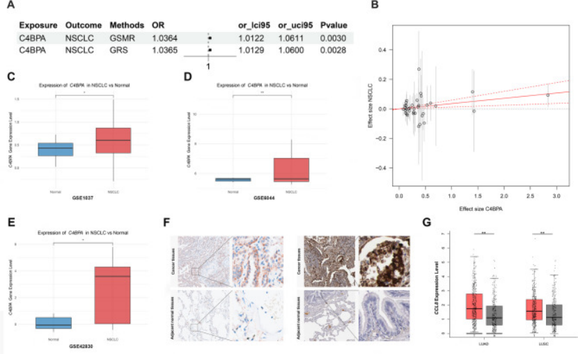 蛋白水平:Human Protein Atlas(HPA)数据库 + 自己做的 IHC(免疫组化),都看到 NSCLC 组织 C4BPA 蛋白强阳性,癌旁阴性(图 3F);