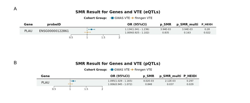 在蛋白层面,21种蛋白与VTE风险相关,12种经共定位验证(图4)。其中PLAU编码的尿激酶型纤溶酶原激活物(uPA)蛋白水平升高,与VTE风险增加显著相关,且在两队列中方向一致(图5B),直接将基因表达与临床表型关联起来。