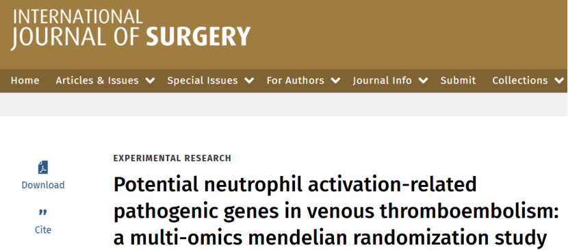 静脉血栓栓塞症(VTE)是临床“沉默的杀手”,现有抗凝治疗常伴随出血风险,找到精准致病靶点迫在眉睫。近日,北京协和医院陈倩、张莉团队联合郭叶教授在外科顶刊《International Journal of Surgery》(IF=10.3,开放获取零版面费)发表重磅研究:通过多组学孟德尔随机化(SMR)策略,首次从甲基化、转录组、蛋白组三个层面,证实PLAU、ALOX12、LGALS3是中性粒细胞活化相关VTE核心致病基因,其中PLAU存在“甲基化上调→表达升高→蛋白累积”的完整致病通路,为血栓靶向治疗提供了全新方向!