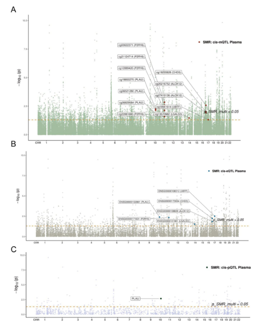 通过两步SMR分析,构建出“甲基化→基因表达→蛋白→VTE”的全链条:PLAU基因的cg06521280等3个位点高甲基化→PLAU表达上调→uPA蛋白累积→VTE风险升高(图6)。