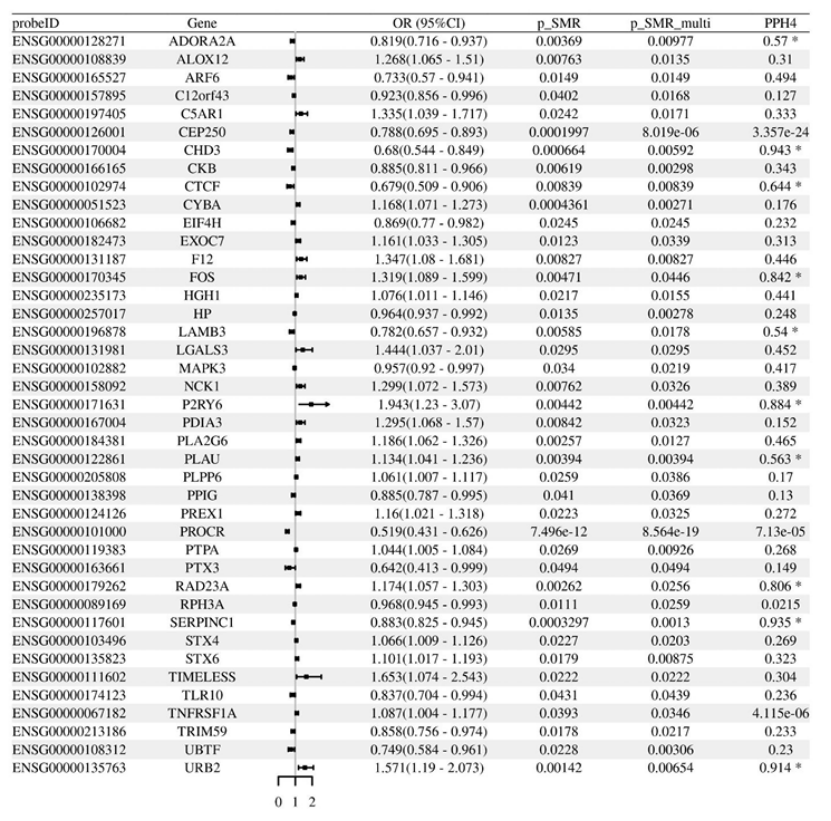 在GWAS Catalog发现队列(2.5万例VTE患者)中,通过SMR分析筛选出223个与VTE相关的甲基化位点,对应120个基因。经共定位分析(PPH4>0.5)验证,64个位点(30个基因)存在明确因果关联(图2)。
