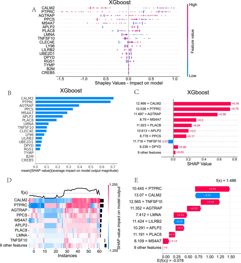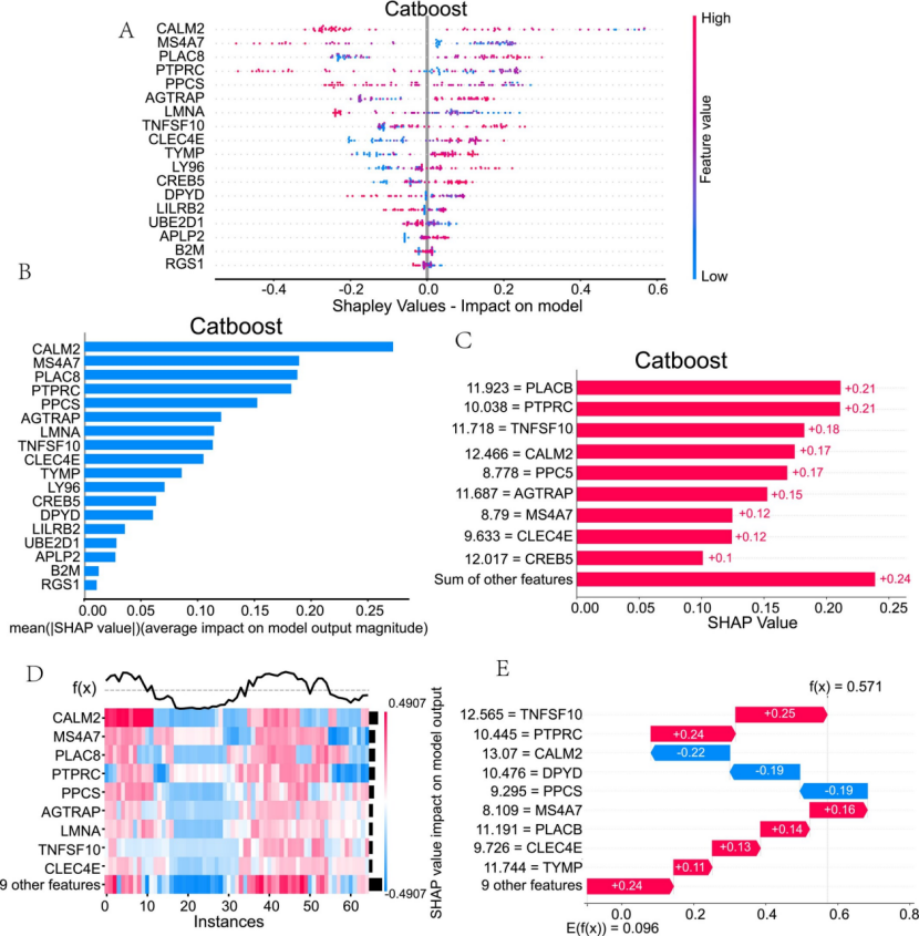 机制讲完了,得做个临床能用的东西!作者用 GSE32707(训练集)和 GSE243068(验证集)的 bulk RNA 数据,先通过 LASSO 回归从 159 个差异基因里筛出 18 个核心基因(图 5A-B),再用 CatBoost、XGBoost、NGBoost 三种机器学习算法建模。结果超惊喜:CatBoost 和 XGBoost 模型的 AUC 都超过 0.7(图 5D),临床诊断价值很高!还用 SHAP 分析找 “最关键的基因”,发现CALM2的 SHAP 值最大(图 6A-C、7A-C)——CALM2 是钙调蛋白,之前就和 ARDS 的炎症、肺泡屏障有关,现在成了诊断模型的 “核心标志物”,医生以后测这个基因就能辅助诊断 ARDS,实用性拉满!
