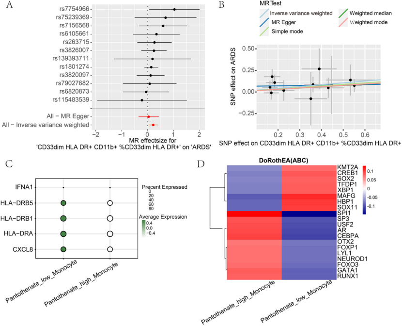 抗原呈递:MR 分析发现,抗原呈递型单核细胞(CD33dim HLA DR+ CD11b+)越多,ARDS 风险越高(图 4B);而泛酸高的单核细胞,HLA-DRB5、HLA-DRA 等抗原呈递标志物表达显著降低(图 4C)—— 简单说就是 “泛酸让单核细胞少搞‘炎症激活’,多搞‘清除垃圾’”,既保护肺又不引发过度炎症,完美解释了 “保护机制”!