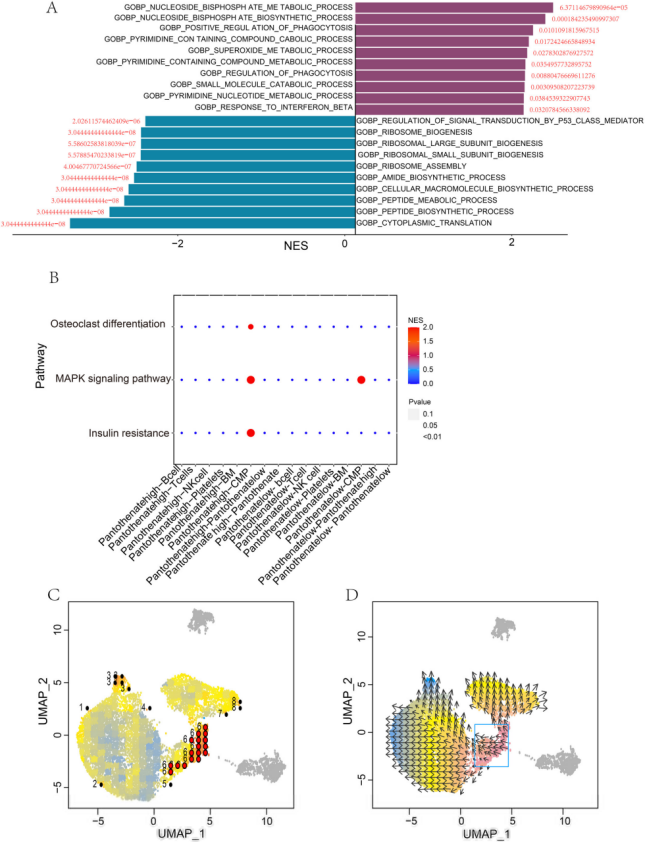 细胞互作:泛酸高的单核细胞和骨髓祖细胞的交互更强,尤其是 TNF-TNFRSF1A 信号(图 3A),说明能调节免疫细胞间的通讯;