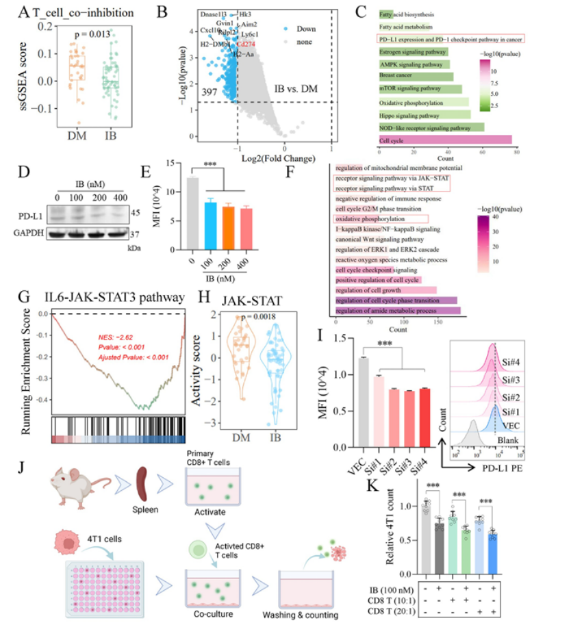 关键结果:① IB 联合抗 PD-1 抗体在 4T1 同基因移植瘤模型中展现显著协同抑瘤效果,大幅提升 CD8+ T 细胞及 TNF-α+ CD8 + 效应 T 细胞浸润(图 7A-C);② 空间转录组分析显示,IB 显著提升肿瘤免疫浸润评分、降低 T 细胞耗竭信号与 PD-L1/PD-1 抑制信号(图 7D-I);③ IB 通过抑制 STAT3 直接下调肿瘤细胞 PD-L1 表达,解除免疫抑制,进而增强 CD8+ T 细胞的肿瘤杀伤能力(图 8A-K)。