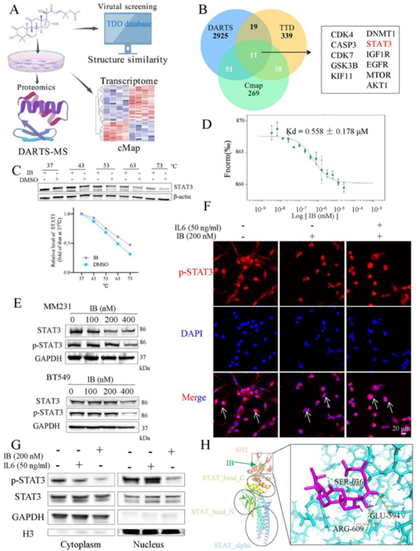 关键结果:① 采用 DARTS-MS 蛋白质谱、结构相似性筛选、CMap 转录组关联分析三种无标记靶点筛选方法,交叉锁定 STAT3 为 IB 直接作用靶点(图 5A-B);② CETSA、MST 实验证实 IB 与 STAT3 蛋白直接结合(解离常数 Kd=558nM),分子对接显示 IB 结合于 STAT3 的 SH2 结构域,阻碍其磷酸化与核转位(图 5C-H);③ STAT3 过表达可逆转 IB 介导的线粒体代谢抑制,证实 IB 通过靶向 STAT3 调控代谢重编程。