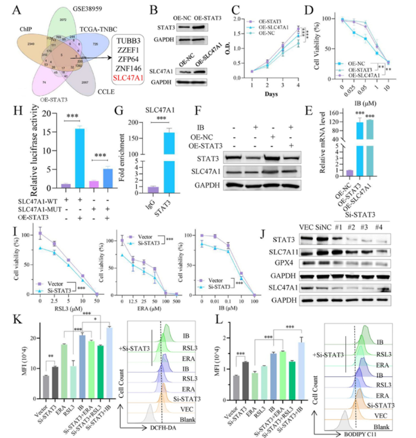 关键结果:① 整合 TCGA、CCLE、ChIP 数据库交集筛选,锁定 SLC47A1 为 STAT3 下游全新靶基因(图 6A);② ChIP-qPCR、双荧光素酶报告实验直接证实,STAT3 可结合 SLC47A1 启动子并转录激活其表达(图 6G-H);③ STAT3 或 SLC47A1 过表达会降低 TNBC 细胞对 IB 的敏感性,而 STAT3 敲低则显著增强 IB 诱导的铁死亡、ROS 累积与脂质过氧化(图 6I-L);该研究首次揭示 STAT3/SLC47A1 轴是乳腺癌铁死亡调控的全新机制。