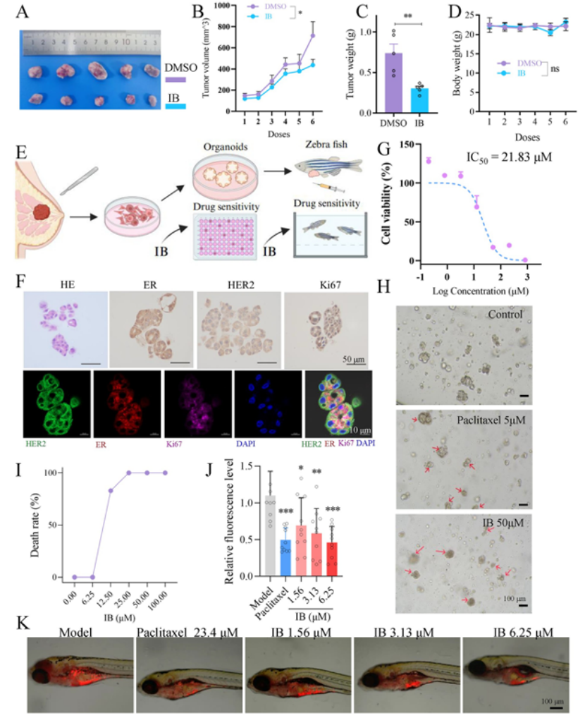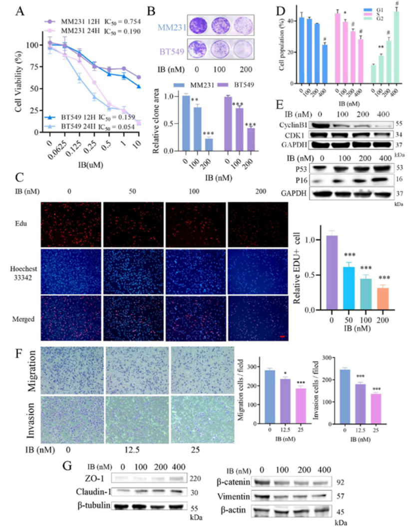 关键结果:① IB 对 TNBC 细胞(MDA-MB-231、BT549)呈现纳米级强效增殖抑制作用,对正常乳腺上皮细胞无明显毒性,可显著抑制克隆形成、诱导 G2/M 期周期阻滞(图 1A-E);② IB 抑制上皮间质转化(EMT),下调间质标志物、上调上皮标志物,强效抑制细胞迁移与侵袭(图 1F-G);③ 在裸鼠异种移植瘤、MMTV-PyMT 自发乳腺癌、患者来源类器官、斑马鱼肿瘤模型中,IB 均显著抑制肿瘤生长,且无明显肝肾功能损伤等脏器毒性(图 2A-J)。