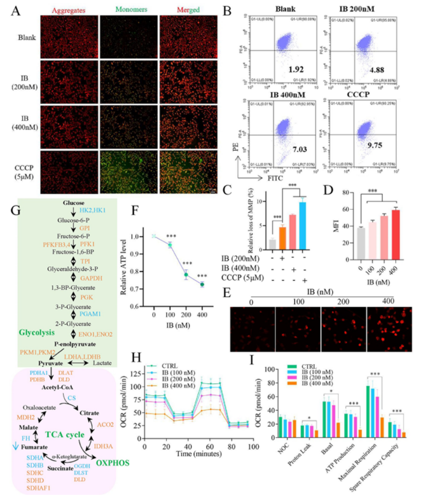 关键结果:① 转录组测序 + GSEA 富集显示,IB 显著上调铁死亡驱动基因,铁死亡抑制剂(Ferrostatin-1、DFO、NAC)可完全逆转 IB 对 TNBC 细胞的杀伤作用(图 3A-D);② IB 显著升高 Fe²+、脂质过氧化物、ROS 水平,下调 SLC7A11/GPX4、上调 ACSL4,透射电镜观察到铁死亡典型的线粒体皱缩、嵴消失特征(图 3E-J,补充图 S5);③ 转录组联合非靶向代谢组分析证实,IB 破坏三羧酸(TCA)循环、抑制氧化磷酸化(OXPHOS),降低线粒体膜电位与 ATP 生成,重塑线粒体代谢(图 4A-I)。