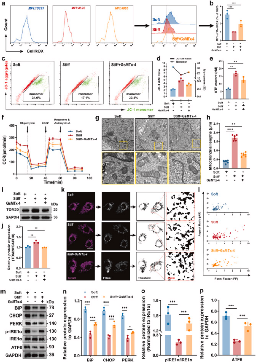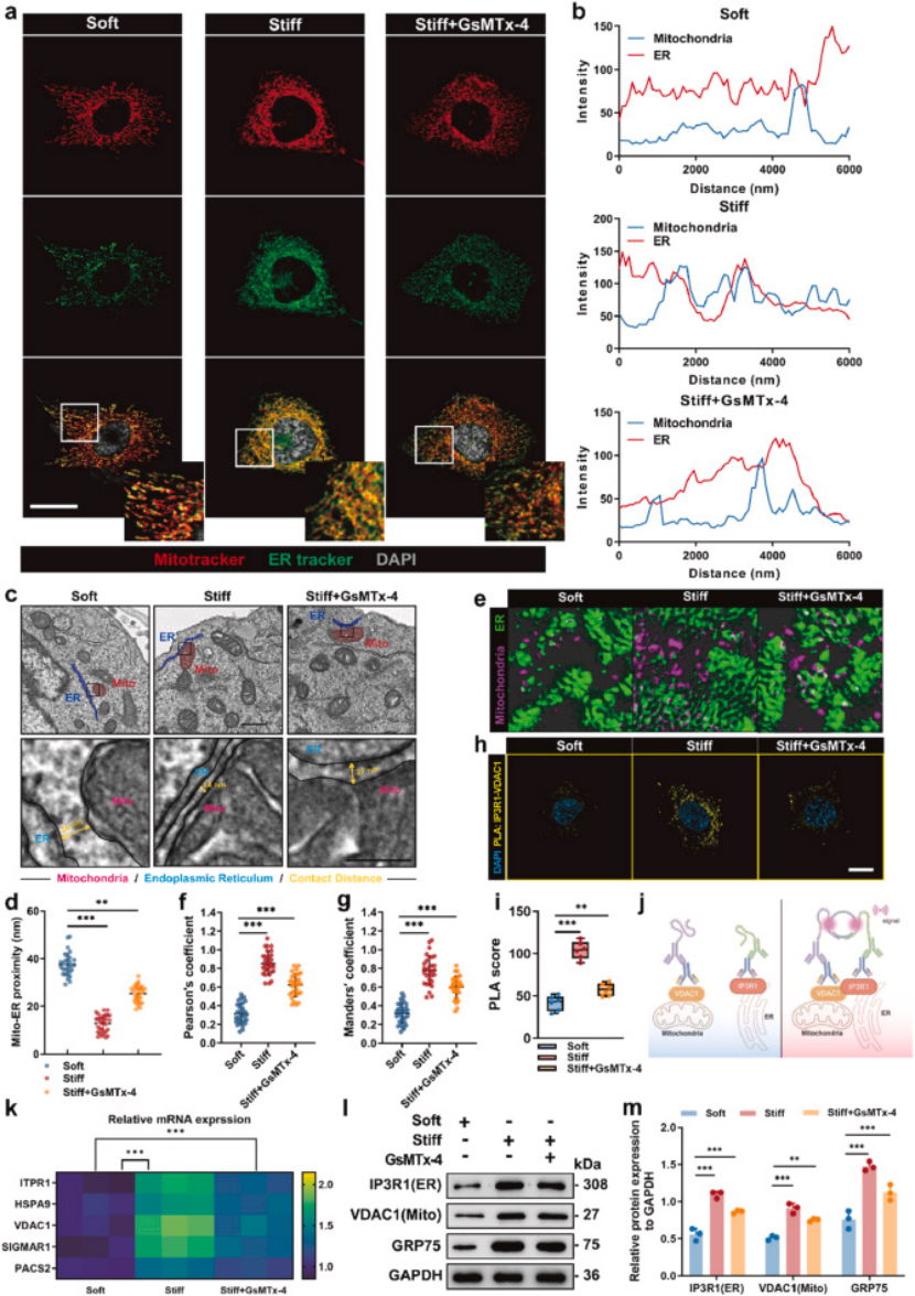 细胞器互作:Piezo1 激活促进线粒体 - ER 接触(MERCs)形成,免疫荧光共定位、透射电镜、邻近连接实验(PLA)均证实,硬凝胶上的癌细胞 MERCs 数量显著增加,GsMTx4 处理可破坏 MERCs(图 5a-j);