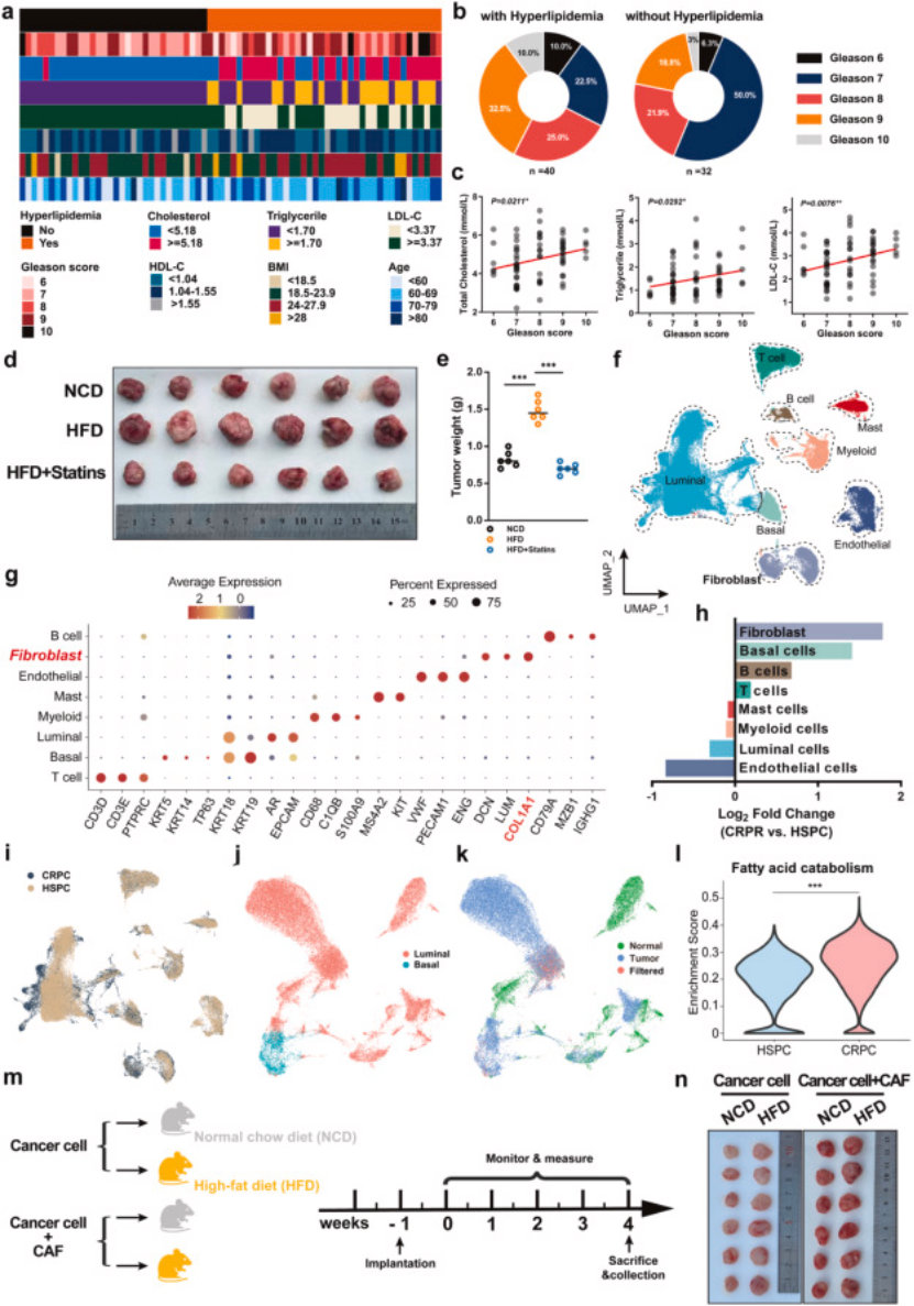 动物实验验证:高脂饮食小鼠的前列腺癌移植瘤生长速度显著快于正常饮食组,他汀类药物可逆转这一效应(图 1d-e、n),证实脂质代谢紊乱的促癌作用。
