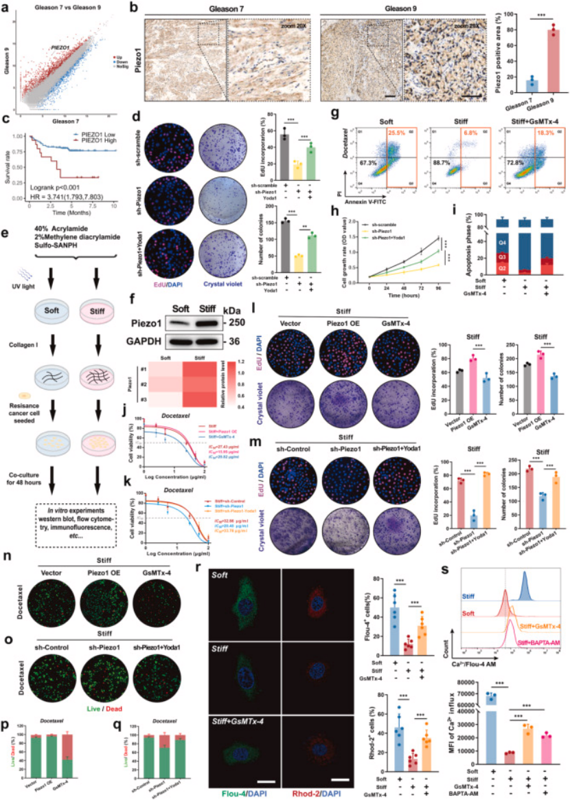 核心验证:① 硬凝胶上的前列腺癌细胞 Piezo1 表达显著升高,对多西他赛的耐药性增强(凋亡率降低、IC50 升高,图 4g、i);② 敲低 Piezo1 或用 GsMTx4 抑制后,硬凝胶上的癌细胞耐药性显著逆转(图 4d、k、m);③ Piezo1 过表达则进一步增强耐药,且硬凝胶环境会放大这一效应(图 4j、l、n);
