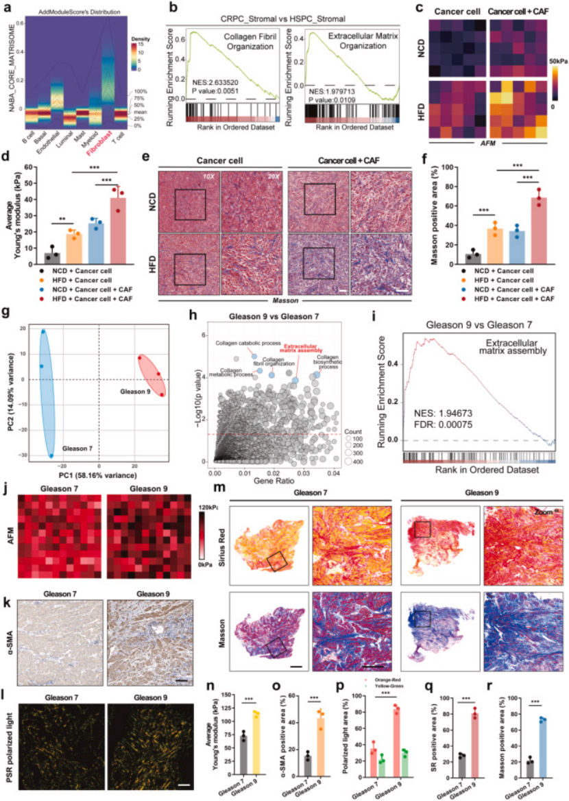 下游效应:活化的 CAFs 大量分泌胶原,导致 ECM 胶原沉积、交联增加,原子力显微镜(AFM)证实,高脂饮食 + CAFs 组肿瘤组织硬度显著高于对照组(图 2c-d),Masson 染色、天狼星红染色均验证了 ECM 僵硬表型(图 2e-f、q-r)。
