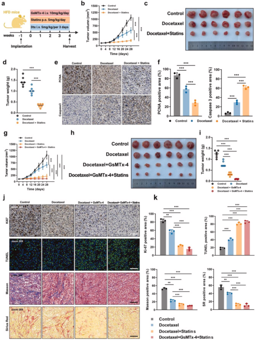 核心结果:① 双靶向组(他汀 + GsMTx4 + 多西他赛)肿瘤体积和重量显著小于单药组,肿瘤抑制率最高(图 7b-d、g-i);② 病理检测显示,双靶向组癌细胞增殖(PCNA、Ki67)降低,凋亡(Caspase-3、TUNEL)增加(图 7e-f、j);③ ECM 重塑改善:天狼星红 / Masson 染色证实,双靶向组胶原沉积减少,ECM 僵硬程度显著降低(图 7k);