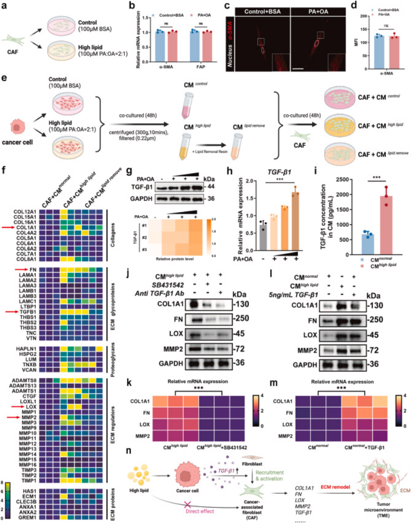 核心机制:高脂环境诱导前列腺癌细胞分泌 TGF-β1(ELISA 证实其分泌量翻倍,图 3g-i),TGF-β1 作为 “信使” 间接激活 CAFs;