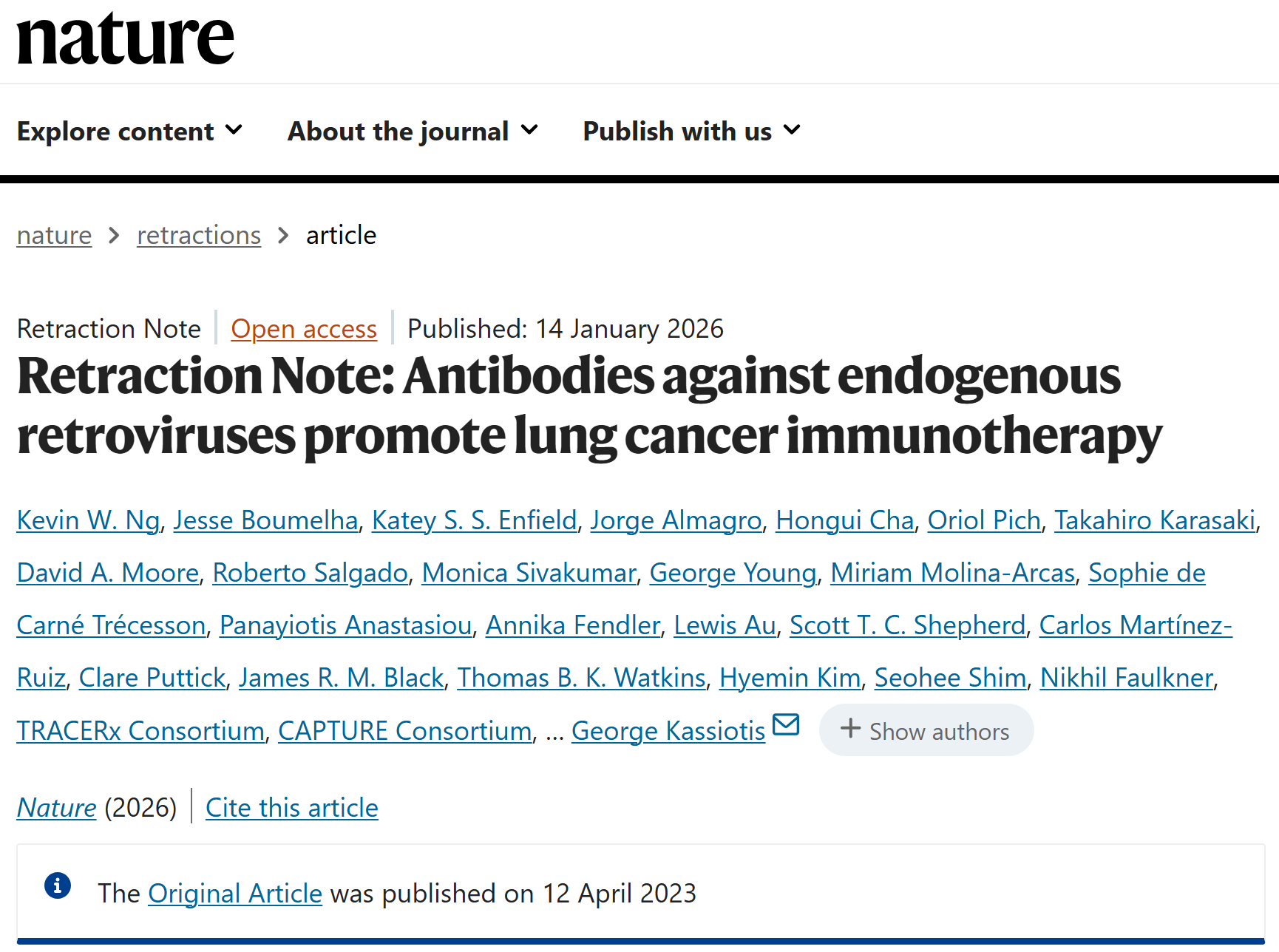 2023年4月12日,弗朗西斯克里克研究所(Francis Crick institute)Kevin W. Ng等人在Nature 在线发表题为“Antibodies against endogenous retroviruses promote lung cancer immunotherapy”的研究论文,该研究的发现为TLS与免疫治疗反应的关联提供了可能的机制基础。