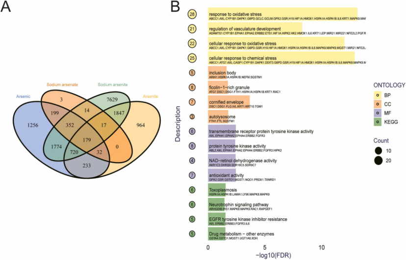 研究者先从CTD 数据库(比较毒理基因组数据库)筛选砷相关基因(ARGs),重点选了 4 种有毒砷形态(亚砷酸盐、砷酸盐等)共同作用的基因,最终得到 179 个 ARGs(图 1A)。接着做 GO/KEGG 富集,一下就抓住了核心通路:氧化应激(比如 “对氧化应激的响应” GO term)和谷胱甘肽代谢(KEGG 通路 hsa00480)(图 1B)—— 这和砷暴露会引发细胞氧化损伤的已知机制完全契合,为后续研究定了方向。