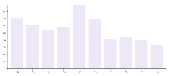 根据WOS收录的文章来看,INTERNATIONAL JOURNAL OF CANCER的年发文量近年来波动较大,逐年呈现下降趋势。2020年700篇,2021年410篇,2022年444篇,2023年399篇,截止到2024年8月,INTERNATIONAL JOURNAL OF CANCER被SCI收录的论文已达327篇。