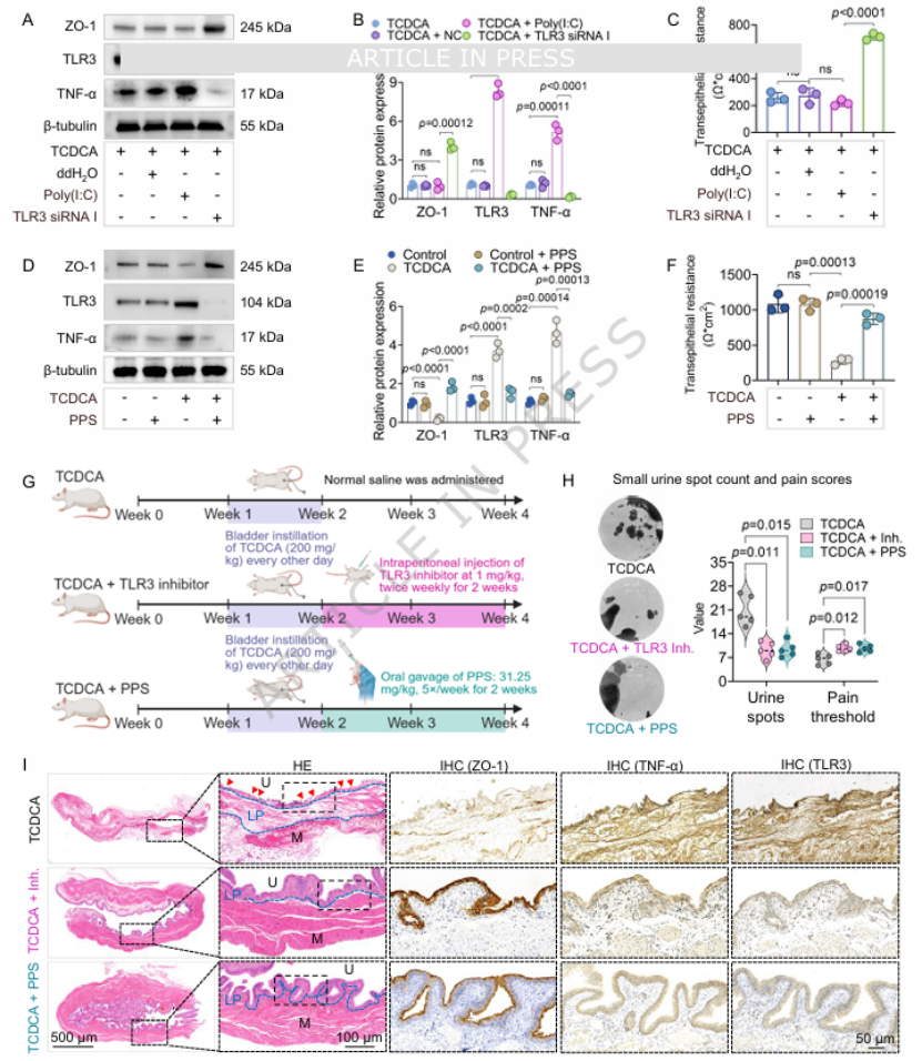 第七步:干预实验证实“有效逆转”——TLR3 抑制 + PPS 可改善损伤针对核心通路设计干预实验:体外培养尿路上皮细胞,TLR3 抑制剂(siRNA 或 CU-CPT 4a)可逆转 TCDCA 诱导的屏障破坏和炎症(图 7A-C);FDA 批准药物 PPS(戊聚糖硫酸钠)也可上调 ZO-1、下调 TLR3 和 TNF-α,恢复细胞屏障功能(图 7D-F)。体内实验中,TLR3 抑制剂或 PPS 治疗可显著改善 TCDCA 诱导的大鼠尿频、疼痛和膀胱病理损伤(图 7H、I),为临床转化提供直接依据。