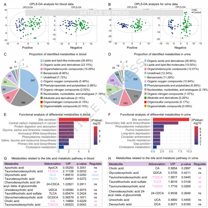 第二步:靶向代谢组发现“毒性介质”——TCDCA 在血 / 尿中双重升高对患者血、尿样本进行靶向代谢组分析,发现胆汁酸代谢是最显著的差异通路(图 2E、F),其中牛磺鹅脱氧胆酸(TCDCA)在 HIC 患者的血液和尿液中均显著上调(图 2G、H),而另一种胆汁酸 TUDCA 则呈保护性作用(与屏障功能正相关)。这一发现首次将胆汁酸代谢异常与 HIC 关联,为 “菌群 - 代谢物” 联动提供直接证据。