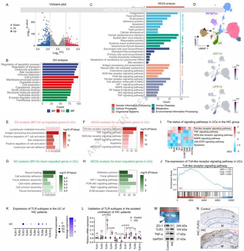 第三步:单细胞测序锁定“作用靶点”——TLR3 在尿路上皮细胞异常激活通过单细胞 RNA 测序解析 HIC 患者膀胱组织,发现尿路上皮细胞(UCs)是损伤核心细胞:上调基因富集于炎症反应、TLR 信号通路,下调基因集中于紧密连接(屏障功能相关)(图 3E-H)。进一步分析显示,TLR3 是尿路上皮细胞中上调最显著的 TLR 亚型(图 3K),且在患者膀胱组织中通过 mRNA 和蛋白水平双重验证(图 3L-N),提示 TLR3 是介导损伤的关键分子。