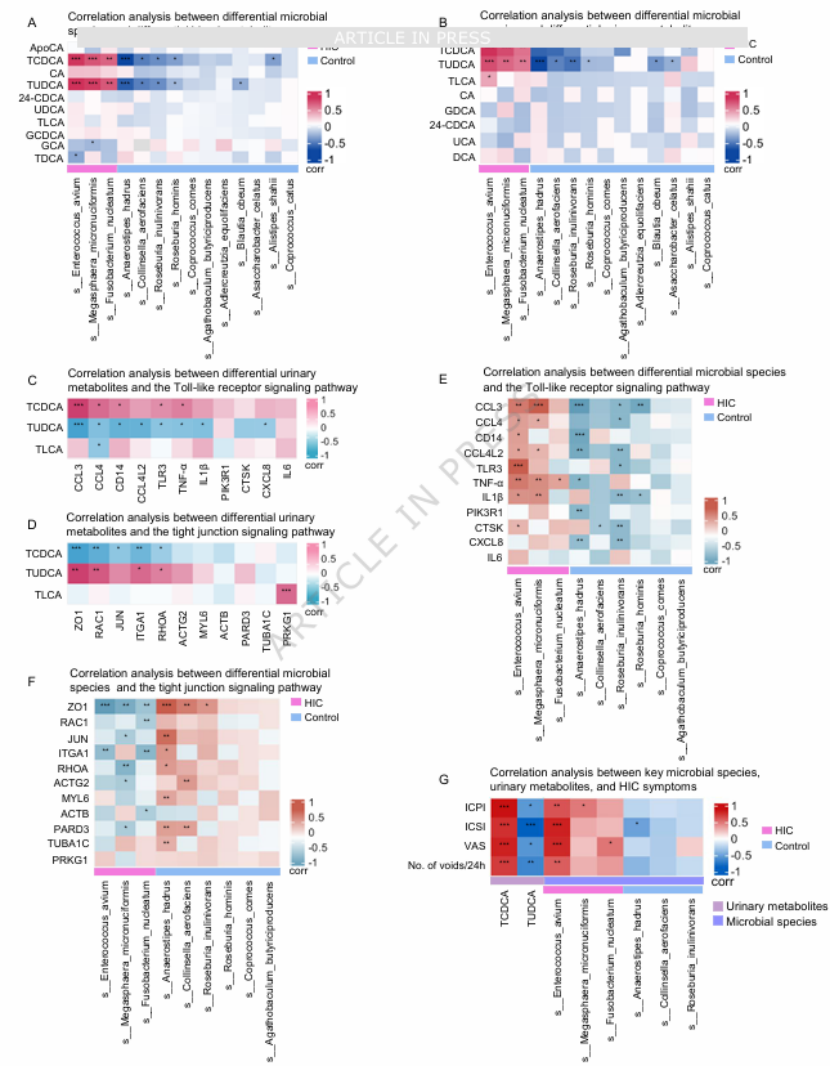 第四步:关联网络证实“三角关系”——E. avium-TCDCA-TLR3 形成致病轴通过 Spearman 相关性分析构建多组学关联网络,证实:E. avium 丰度与血 / 尿 TCDCA 水平正相关(图 4A、B);TCDCA 与 TLR3 表达正相关,与紧密连接蛋白(如 ZO-1)表达负相关(图 4C、D);且 E. avium 丰度和 TCDCA 水平均与患者症状评分(尿频、疼痛)正相关(图 4G),直接证实三者构成 “菌群 - 代谢物 - 受体” 的致病通路。