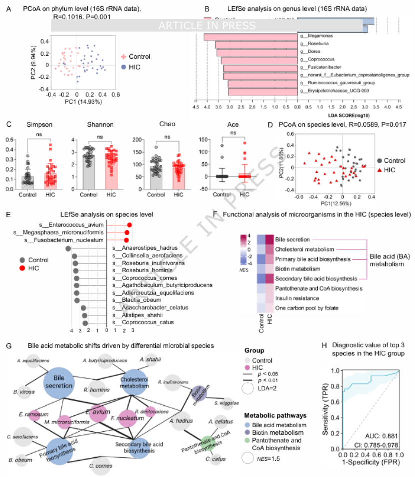 第一步:宏基因组锁定“元凶” 菌群 ——E. avium 在 HIC 患者中显著富集研究首次对 HIC 患者进行粪便宏基因组测序(突破 16S 测序的低分辨率局限),发现 HIC 患者肠道菌群组成与健康人存在显著差异(图 1A、D),其中鸟肠球菌(E. avium)、微小巨球藻等物种富集,且这 3 种核心差异物种的诊断特异性达 88.1%(图 1H)。功能分析显示,这些差异菌群的核心功能集中在胆汁酸代谢(图 1F、G),提示菌群可能通过调控胆汁酸影响膀胱病变。