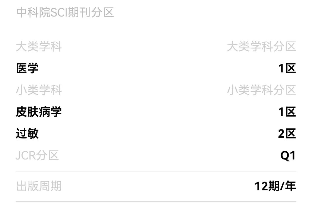 尽管面临诸多挑战,《CONTACT DERMATITIS》仍未失去其领域价值。作为接触性皮炎领域的老牌期刊,其征稿范围覆盖环境性皮炎全领域,包括化妆品、医疗器械引发的皮炎及药物延迟性过敏反应等前沿方向,仍是该领域科研人员获取前沿成果、了解临床实践的重要信息源。对于皮肤科、过敏学领域的科研人员而言,若研究方向高度契合,该刊现阶段仍具备一定的投稿价值,但需充分考量其未来分区变动的风险。