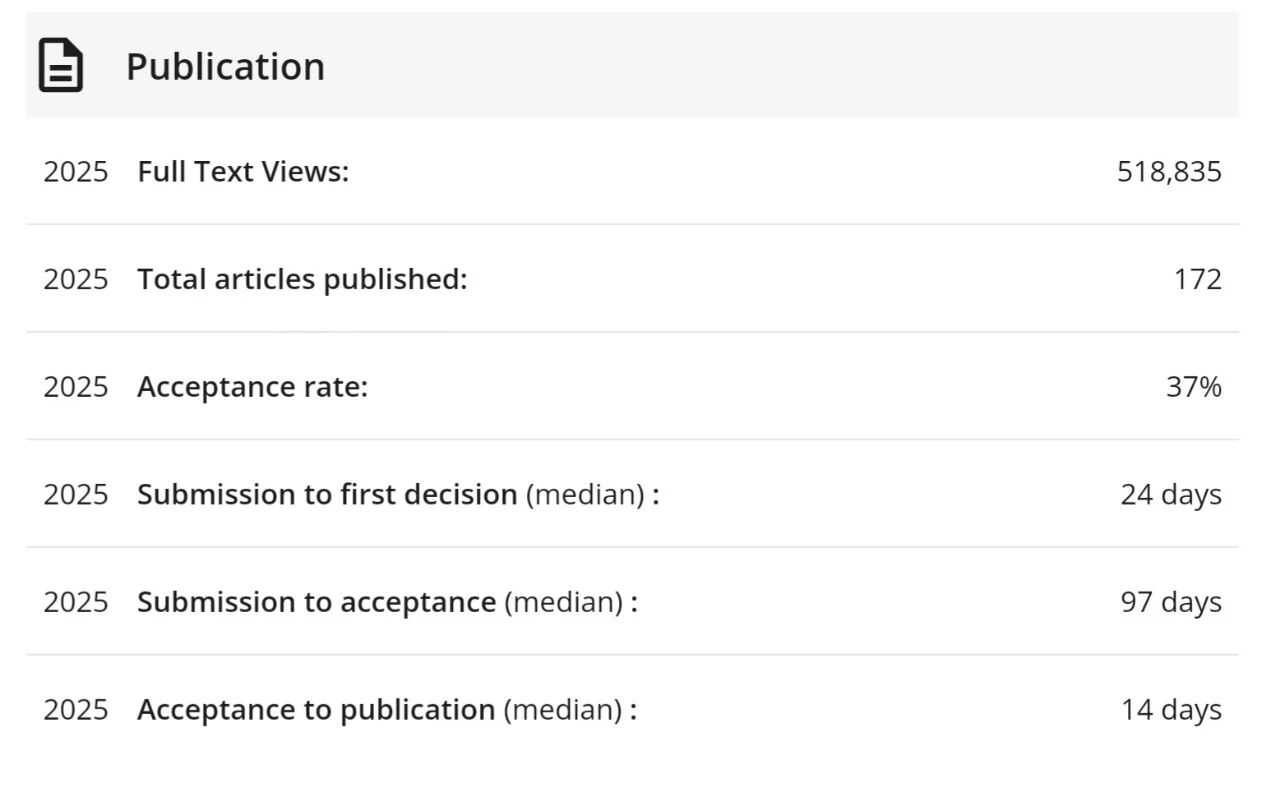 从期刊的运营与投稿数据来看,其虽保持着中等水平的审稿效率——2025年接收率31%,初审24天,从提交到接收平均97天,上线仅14天,且采用混合出版模式,传统订阅无需版面费,OA模式则需支付5060美元APC费用,看似投稿门槛适中,但文章来源的单一性,也限制了其国际影响力的拓展。
