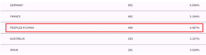 其中,中国学者累计发文409篇,仅占比4.407%。